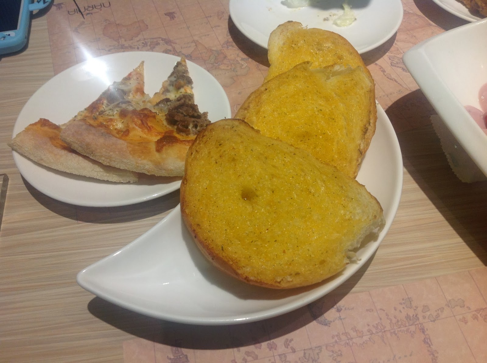 | 「法式帕瑪森香蒜麵包+披薩」因為披薩來太多種忘了什麼口味的,蒜麵包普普摟!披薩也建議兩人一塊,才不會過早GAME OVER啦! |